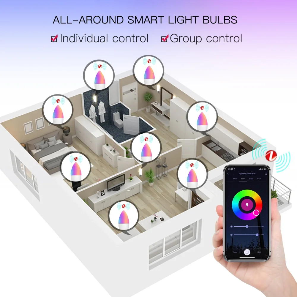 The ZigBee Smart E14 Candle LED Light is an intelligent 5W LED bulb that offers a wide spectrum of colors and color temperatures ranging from 2200K to 6500K. With ZigBee technology, it integrates seamlessly into your smart home and enables the creation of various lighting scenes to match your mood. More
