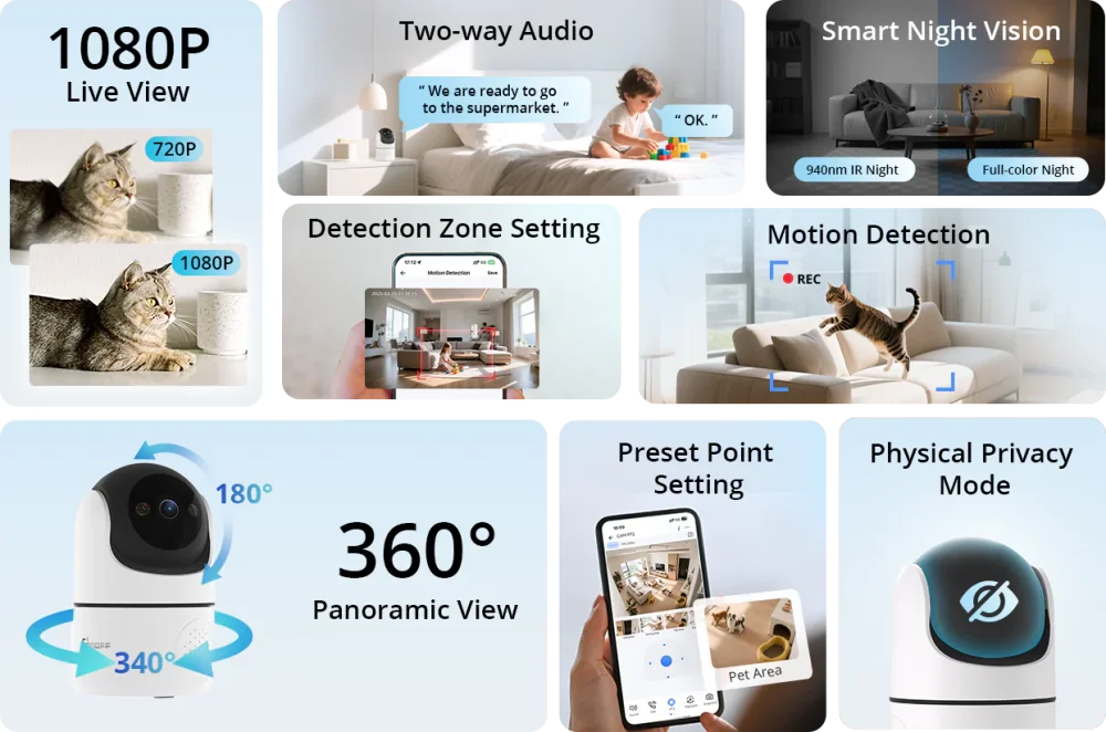 Motorické otáčení: 340° horizontálně / 180° vertikálně, ovládání přes appku