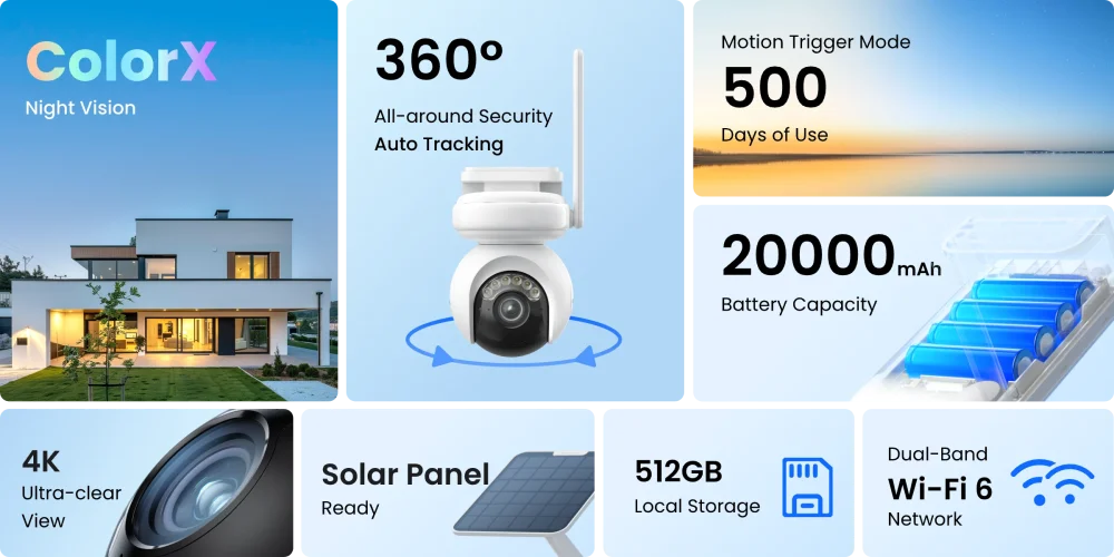 🔋 Napájanie a batérie: Vysoko kapacitná 20 000 mAh batéria s možnosťou solárneho nabíjania, ideálna pre dlhodobé bezdrôtové použitie.